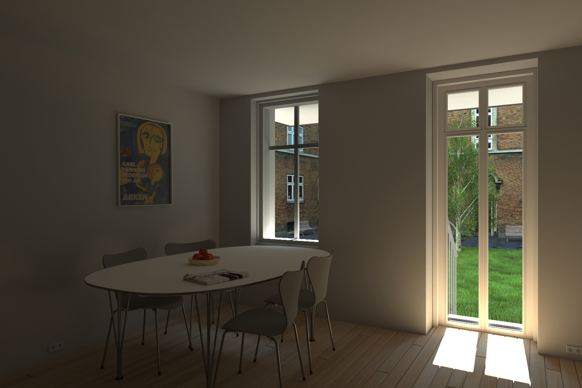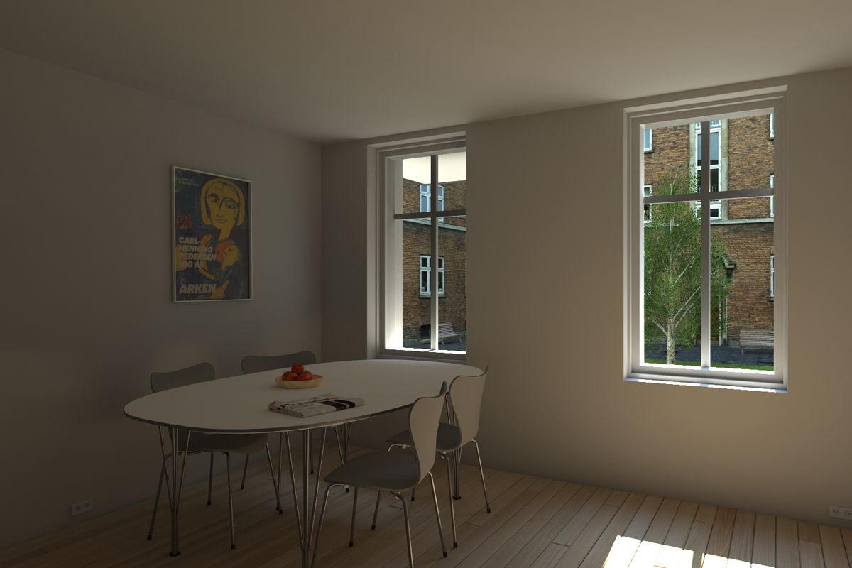 Du kan her se, hvordan altaner kan påvirke dagslyset hos underboen. Der er taget udgangspunkt i en solskinsdag i april kl. 12 i en lejlighed, hvor stuen vender ud til gården. Der simuleres forskellige situationer med og uden altan. Rummet har en loftshøjde på 2,6 meter og bygningerne er fem etager høje. Selve gården er 20 meter lang og 20 meter bred.