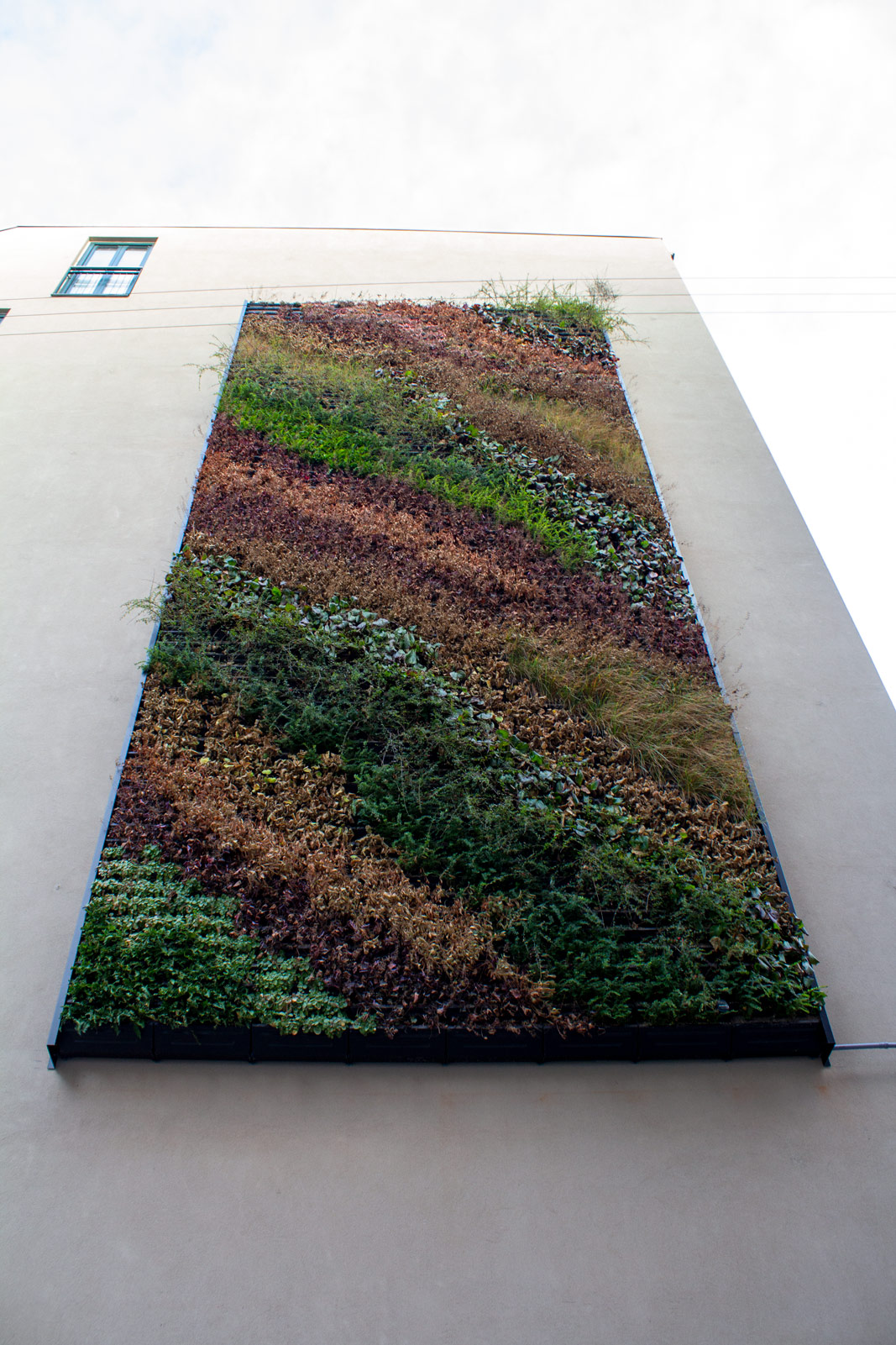 Gavlen er hovedsageligt bestående af stedsegrønne planter, nærmere 75 %, hvilket vil sige, at de vertikale bede har et grønt livligt