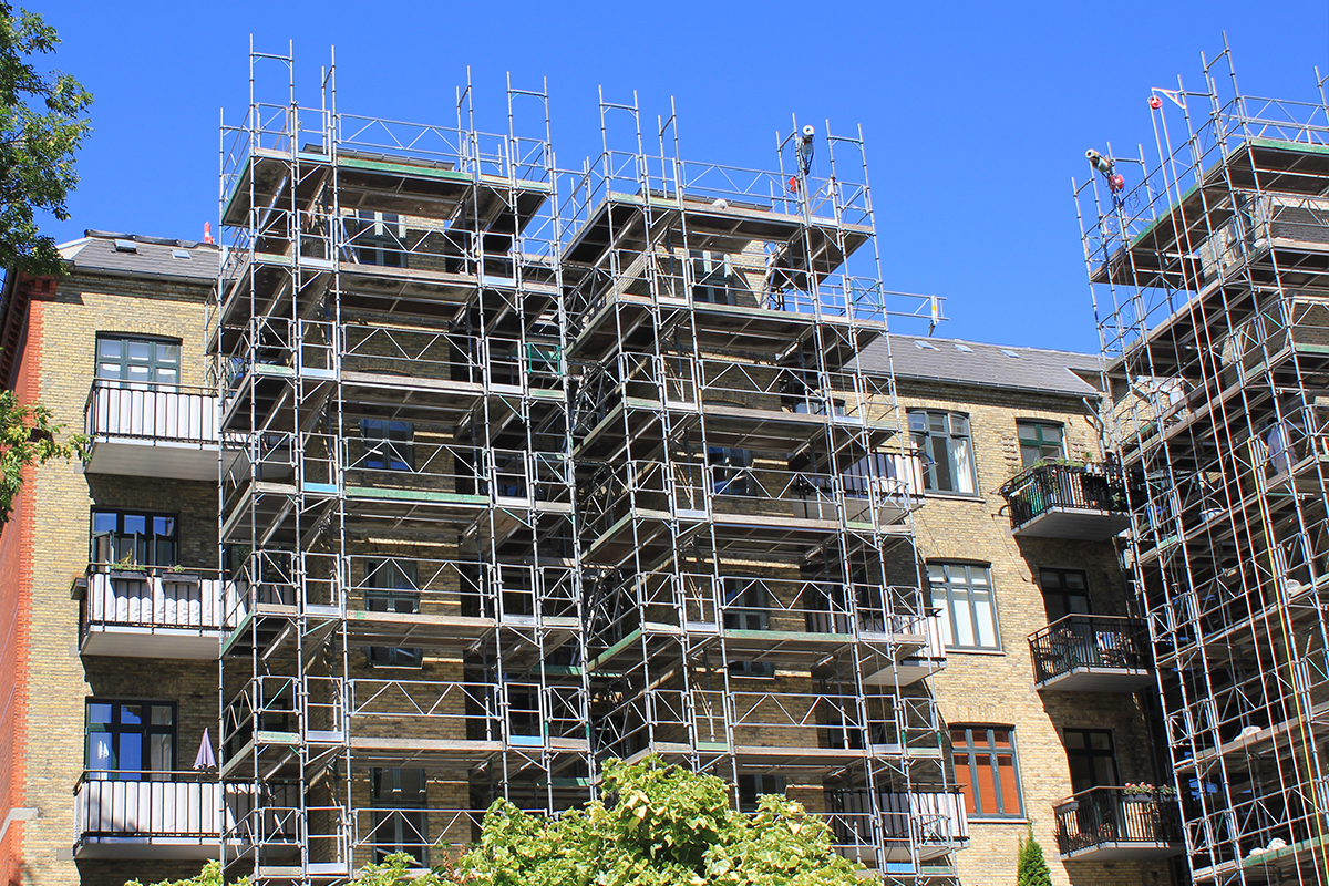 Er der tale om en etageejendom, vil der, før arbejdet på facaden kan gå i gang, typisk skulle opsættes stillads rundt om bygningen. Stilladset sikrer, at håndværkerne kan arbejde i højden.
